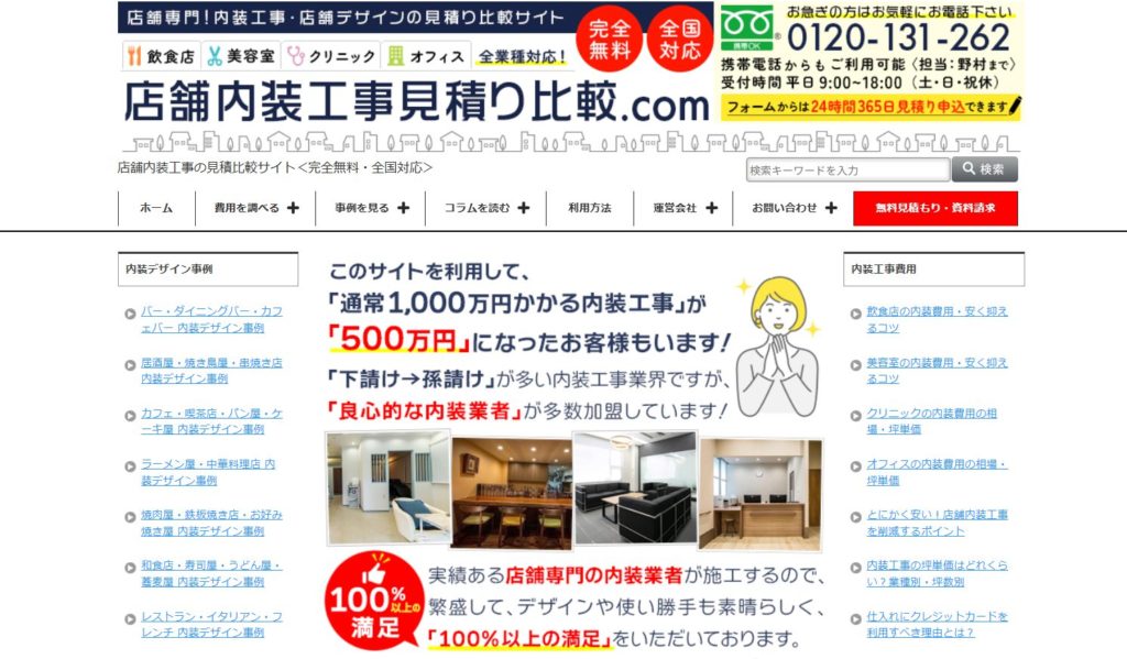 特徴:店舗内装工事見積り比較.comは、飲食店や店舗専門の内装業者から、無料で見積もり・デザイン提案を受け取り、比較できる全国対応のサービスです。