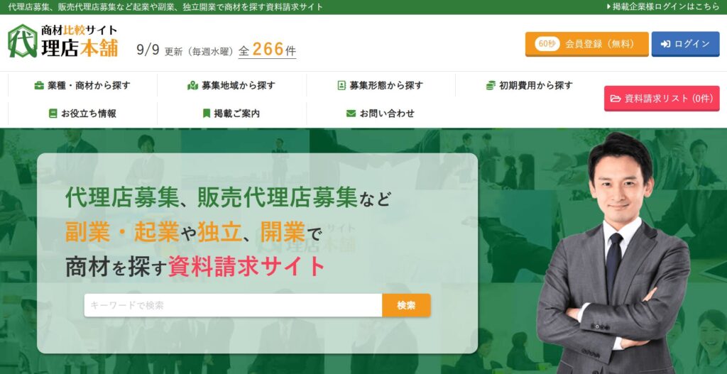 特徴:代理店本舗は、代理店募集や営業商材、営業代行など、代理店向けの商材情報サイトです。流行の商材や定番の人気商材を多数取り扱っており、掲載数は日本一。独立開業や起業、新規ビジネス向けの商材探しに便利な情報源として活用できます。