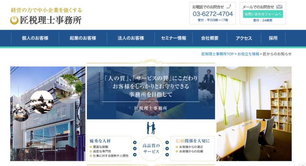 特徴:武蔵小杉や元住吉の税理士・会計事務所は匠税理士事務所へ。【世界4大会計事務所出身の40代税理士】が、武蔵小杉や元住吉近くで会社設立・創業融資など起業支援や法人化や決算など税務会計コンサルティングを行う税理士事務所です。