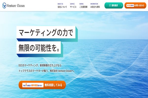特徴:株式会社Venture Oceanは、新規事業やD2Cに特化したマーケティングコンサル会社です。新規事業立ち上げコンサルティング、D2Cコンサルティング、商品開発コンサルティングなどのサービスを行われています。代表は1年で70億のブランドを立ち上げた経験があり、新規事業のプロが集っております。マーケティングでお悩みの方はぜひ一度、ご相談ください。